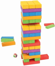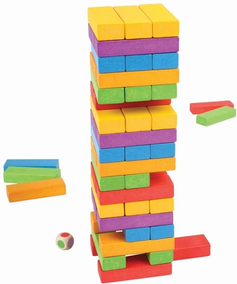 Ein Bau- und Geschicklichkeitsspiel, das die ganze Familie begeistert. Würfle mit dem bunten Würfel, ziehe den passenden Stein und lege ihn oben auf – der Turm wächst, und die Spannung auch! Dank der hochwertigen Holzverarbeitung und der satten Farben ist das Spiel langlebig, sicher und optisch ansprechend.