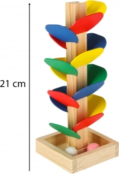 Kinder lassen die Kugel von der Spitze los, und sie dreht sich über die einzelnen bunten „Blätter“ und gleitet bis zur Basis. Jeder Aufprall erzeugt einen angenehmen Klang und motiviert zu weiteren Versuchen. Das Spiel fördert auf natürliche Weise die Feinmotorik, die Hand–Auge-Koordination, Geduld sowie das Farbempfinden und das Verständnis von Ursache–Wirkung.