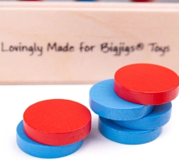 Die roten und blauen Spielsteine sind mit ungiftigen Farben und Lacken beschichtet, die den europäischen Normen entsprechen.