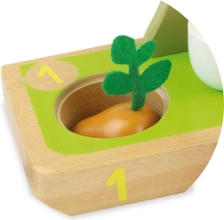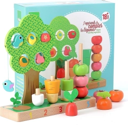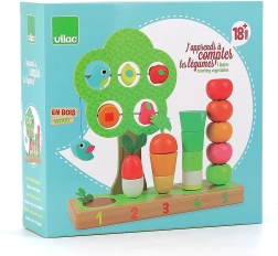 Dieses hochwertige Holzspielzeug vereint Spaß und Lernen. Kinder stecken und fädeln Karotten, Lauch, Cocktailtomaten und weitere Formen auf die nummerierten Stifte 1–5 und eignen sich so ganz natürlich das Zählen sowie das Sortieren nach Farben und Größen an. Außerdem ist ein Bäumchen mit Schiebeelementen enthalten, das zum Entdecken einlädt und die Hand-Auge-Koordination trainiert.