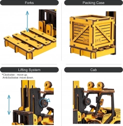Das Gabelstaplermodell wird durch funktionale Elemente zum Leben erweckt – drehbare Räder und ein Hebemechanismus verleihen dem Bau mehr Realismus und Spielspaß.