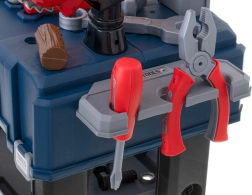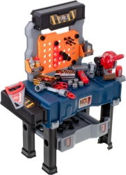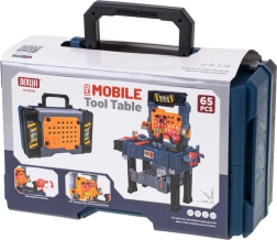 Praktischer Kinder-Werktisch in Form eines Koffers verwandelt jedes Zimmer in eine kleine Werkstatt. 65-teiliges Set aus Kunststoffwerkzeug und Zubehör fördert Feinmotorik, Kreativität und Rollenspiele. Der Koffer lässt sich einfach in eine stabile Werkbank verwandeln mit Lochwand, Ablagen und großer Arbeitsfläche.