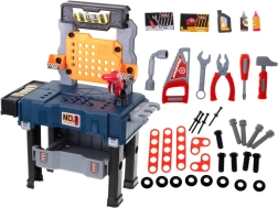 Werkbank/Koffer, 12 Schrauben, 6 kurze Schrauben, 6 Muttern/Aufsätze, 4 Nägel, Säge, Handsäge, 2 Schlüssel, Schraubendreher, Hammer, Zange, Verbinder, Aufkleber