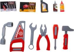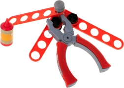Enthalten sind Schrauben, Muttern, Nägel, Säge, Schlüssel, Schraubendreher, Hammer, Zange sowie Verbinder – alles für realitätsnahes und kreatives Spiel.