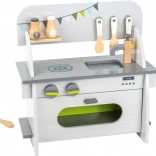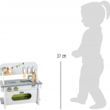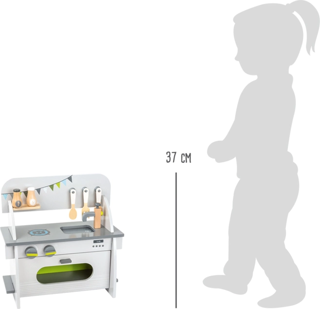 Diese stylische und robuste Kinderküche im kompakten Format ist ideal für kleinere Zimmer. Sie bietet realistische Elemente, die Kreativität, Feinmotorik und Rollenspiele fördern. Die Drehknöpfe geben beim Verstellen ein angenehmes Klicken von sich, und die magnetische Ofentür lässt sich leicht öffnen und schließen.