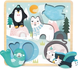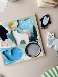 Dieses sensorische Holzpuzzle mit Motiven von Polartieren (Pinguin, Eisbär, Seehund, Wal und Vögelchen) weckt die Entdeckungsfreude. Nach dem Herausnehmen der massiven Teile ertasten Kinder Untergründe mit unterschiedlichen Texturen, die das Wahrnehmen von Oberflächen fördern und beim Unterscheiden von Formen und Materialien helfen. Die robuste Holzausführung ist langlebig und auch für kleinste Hände leicht zu greifen.