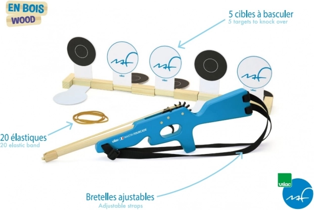 Das Holzgewehr ist mit verstellbaren Textilgurten ausgestattet, ideal für jedes Kind. Das Set enthält fünf klappbare Ziele und zwanzig Gummibänder für wiederholtes Schießen. Versuchen Sie, die Ziele auf unterschiedliche Entfernungen einzustellen und testen Sie Ihre Genauigkeit!