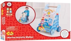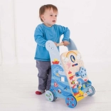 Das Lauflernhilfe beinhaltet verschiedene Aktivitäten wie Schiebepuzzles und drehbare Blöcke, die die motorischen Fähigkeiten und Koordination fördern.