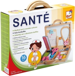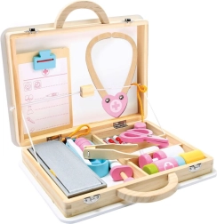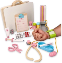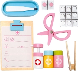 Das Set umfasst hölzerne Werkzeuge wie Stethoskop, Spritze und weitere Hilfsmittel, die realistisches Spielen unterstützen.