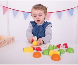 Das realistische Schneidebrett und das Holzmesser unterstützen gefahrloses Spielen in der Küche. Die Obstteile halten zusammen und lassen sich beim Schneiden leicht trennen.