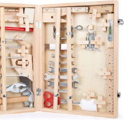Im Koffer ist alles enthalten, was man für kleine Hausprojekte und Rollenspiele als Handwerker braucht: Schlüssel, Schraubendreher, Säge, Schere, Stechbeitel, Zimmermannsbleistift, Inbusschlüssel, Hammer und weiteres Zubehör. Das 48-teilige Set fördert Feinmotorik, Konzentration und Kreativität.
