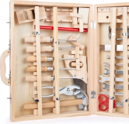 Komplettes Set für kleine Heimwerker in einem eleganten Werkzeugkoffer aus Holz. Enthält 48 Teile aus Holz- und Metallwerkzeug wie Schlüssel, Schraubendreher, Säge oder Hammer. Jedes Teil hat seinen Platz und wird durch Sicherheitsverschlüsse für eine übersichtliche und sichere Aufbewahrung fixiert.