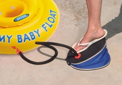 Hocheffiziente Fußpumpe von INTEX für bequemes Aufpumpen von Matratzen, Bällen und anderen aufblasbaren Gegenständen. Sie verfügt über drei universelle Aufsätze und rutschfeste Rillen für einfachere Handhabung.