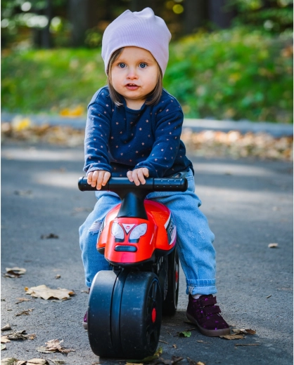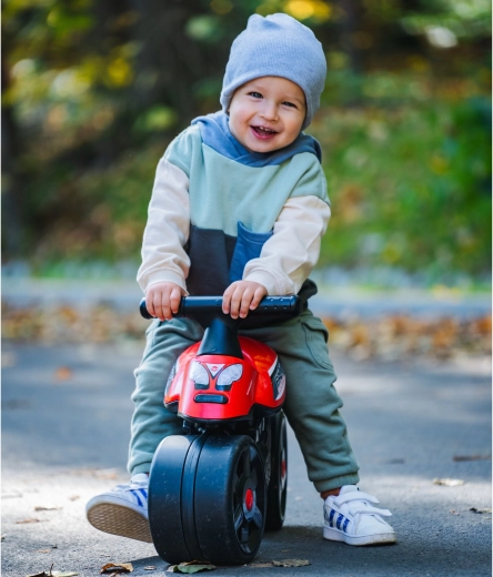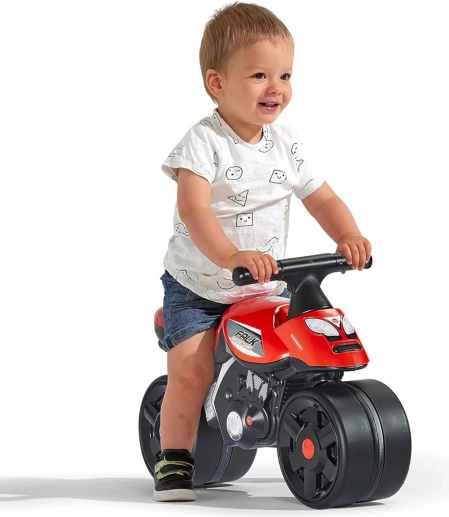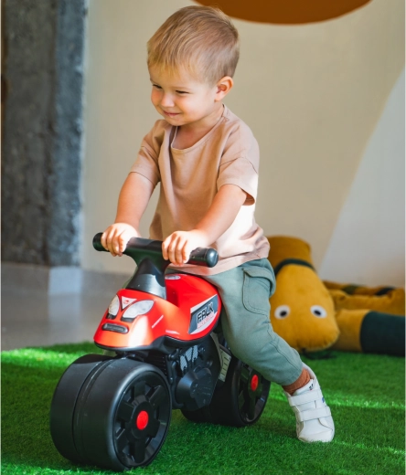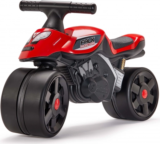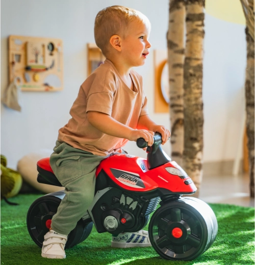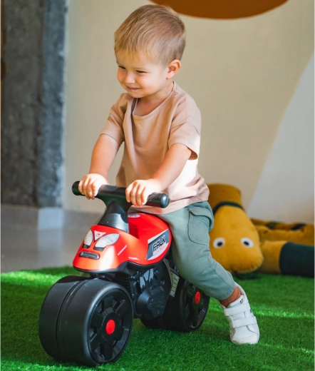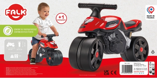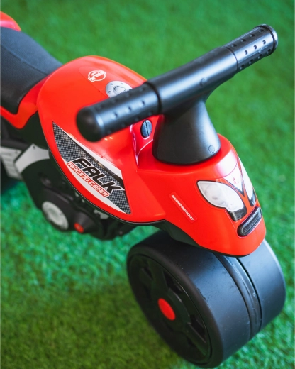 Das rote Laufrad-Motorrad FALK Racing ist eine hervorragende Wahl für die ersten selbstständigen Fahrten. Dank der breiten Räder ist es auf verschiedensten Untergründen sehr stabil, und das drehbare Vorderrad erleichtert das Manövrieren auch auf kleiner Fläche. Die hochwertige Verarbeitung aus sehr widerstandsfähigem Kunststoff eignet sich für tägliches Spielen drinnen und draußen.