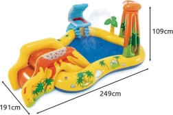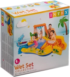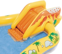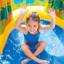 Verwandeln Sie heiße Tage in puren Spaß. Der aufblasbare Wasser-Spielplatz von INTEX bietet fünf Attraktionen in einem: ein flaches Planschbecken zum Toben, eine weiche Rutsche mit gepolsterter Landung, eine erfrischende Fontäne und einen Wasservorhang, die an den Schlauch angeschlossen werden, sowie lustigen Wasser-Basketball mit bunten Bällen. Dank der universellen Maße eignet er sich für Garten, Terrasse und sogar für Ausflüge an den Strand.