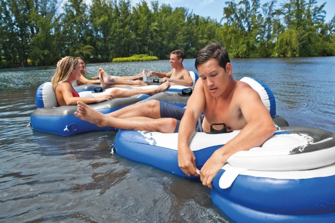 Hergestellt aus vorgetestetem, robustem Vinyl. Ungefähre Größe 1,30 m x 1,26 m. Kein Spielzeug, für Freizeitsport gedacht. Stabile Griffe. Einfach mit weiteren River Run Produkten verbindbar. Zwei Luftkammern, Getränkehalter. Reparaturflicken beigefügt.