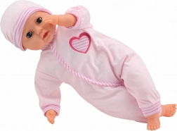 Rosa Babypuppe mit gestreifter Strickjacke, Mützchen, Schal und Zubehör 35 cm