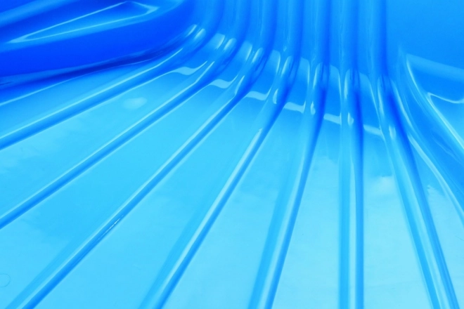 Blauer Muschel-Sandkasten aus Kunststoff. Maße des Sandkastens: 87×78×20 cm.