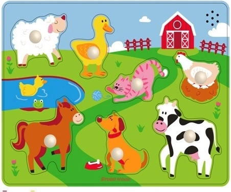 Das Einlegepuzzle hilft, den Wortschatz zu erweitern – beim Spielen lernen Kinder, Tiere zu benennen (Kuh, Schaf, Pferd, Henne u. a.) und Farben sowie Formen wahrzunehmen. Die hochwertige Holzverarbeitung der Marke STUDO WOOD ist robust und sicher für kleine Kinderhände.