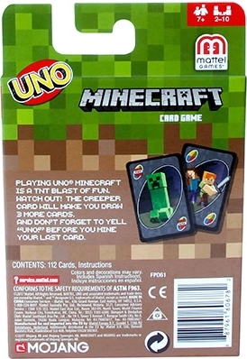 UNO Minecraft verbindet die klassische UNO-Dynamik mit der ikonischen Welt von MINECRAFT. Ziel ist es, so schnell wie möglich alle eigenen Karten abzulegen, Farben und Zahlen zuzuordnen und die Aktionskarten clever einzusetzen. Die Minecraft-Edition fügt die einzigartige Karte Creeper hinzu – sobald du sie ziehst und zeigst, müssen die anderen Spieler 3 Karten aufnehmen.