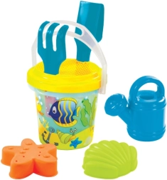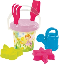 Alles an einem Ort: ein Eimer mit einem Fassungsvermögen von 1,3 l, Rechen, Schaufel, Sieb, Gießkanne und zwei Förmchen für einfaches Formen und Bauen von Sandburgen.