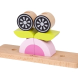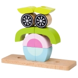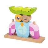 Farbige Holzelemente auf einer Basis mit Stiften ermöglichen das Gestalten einer Eule sowie weiterer Formen und Tiere. Das Spielzeug wächst mit dem Kind – von einfachen Zusammenstellungen bis hin zu komplexeren.