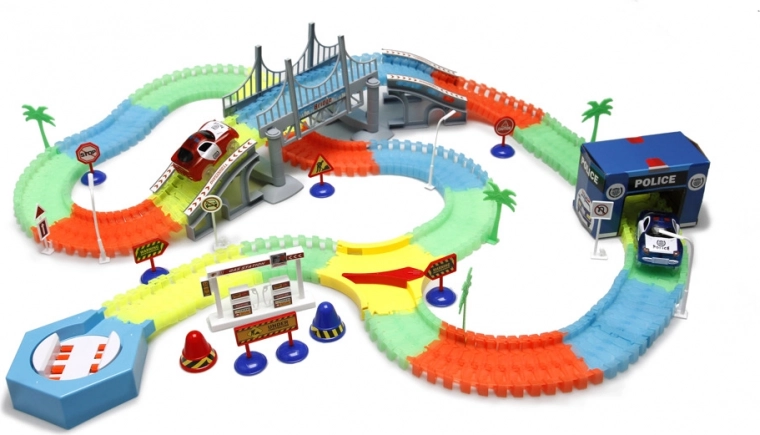 Die leuchtende Rennstrecke mit 220 flexiblen Teilen bietet kreativen Bau- und Rennspaß – auch im Dunkeln. Die Teile lassen sich einfach ineinanderklicken, sodass Sie Geraden, Kurven und Brückenabschnitte gestalten und die gesamte Strecke im Handumdrehen verändern können.