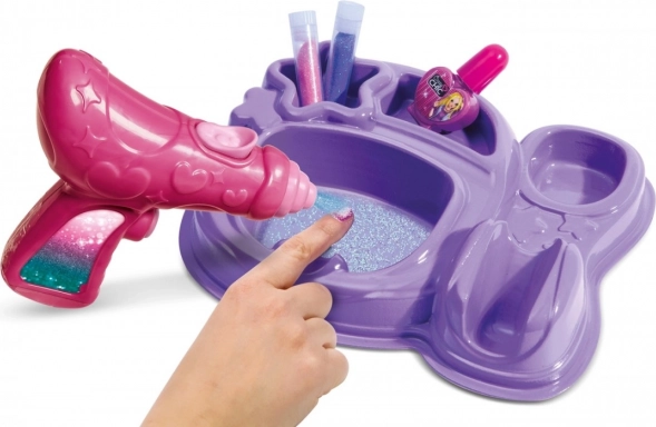 Im Lieferumfang enthalten sind rosa und violetter Glitzer, Nagellack und eine illustrierte Anleitung, die eine einfache und sichere Anwendung ermöglicht. Perfekt für kreatives Gestalten allein oder einen fröhlichen Nachmittag mit Freundinnen.