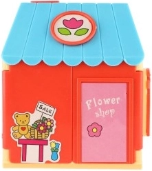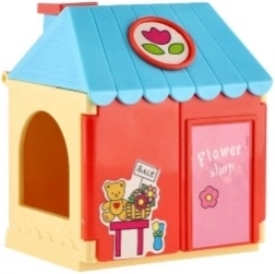 Fröhliches Häuschen mit Blumenmotiven und Kasse lehrt Kinder, Farben zu kombinieren, zu arrangieren und sich um Kunden zu kümmern.
