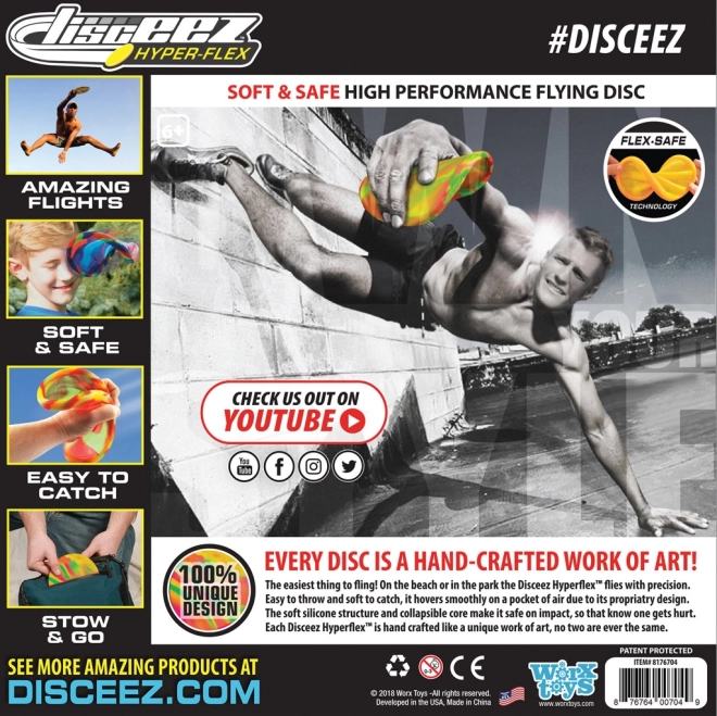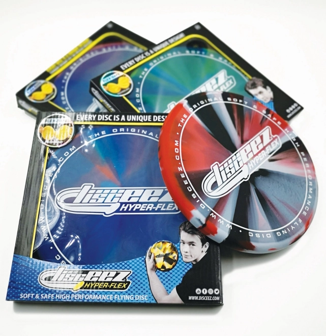 Genießen Sie Spaß draußen und zu Hause mit der DISCEEZ Hyper-Flex Flugscheibe. Dank des weichen Gummimaterials ist sie sicher, fliegt hervorragend, lässt sich leicht fangen und bietet ein cooles Design. Auch für Wasser geeignet und ideal für Kinder ab 6 Jahren.