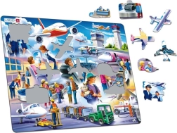 Tauchen Sie ein in die Welt der Piloten, Flugbegleiter und Passagiere mit dem LARSEN-Puzzle Flughafen. Das Bild besteht aus unregelmäßigen Teilen ohne klassische Verriegelungen, was eine frische Herausforderung bietet und Fantasie sowie Feinmotorik der Kinder fördert. Dank des stabilen Randes und der Tafelausführung ist das Puzzeln einfacher und das Verstauen mühelos.