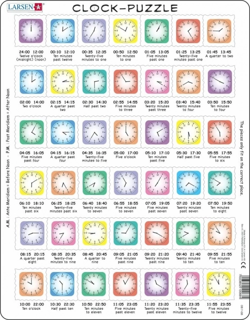 Das LARSEN Lernpuzzle mit Uhrenmotiv ist ein hervorragendes Hilfsmittel für die ersten Schritte im Umgang mit der Zeit. Kinder lernen spielerisch, wann Zeit für Frühstück, Mittag- oder Abendessen ist, und zugleich, die Uhr mit Zeigern zu lesen. Hochwertiger Karton und stabile Teile gewährleisten eine lange Lebensdauer auch bei häufiger Nutzung.