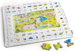 Larsen Puzzle Englisch ist besonders für diejenigen gedacht, die gerne auf unterhaltsame Weise lernen. Auf der Wiese hinter dem Dorf oder am Teich können Sie verschiedene Figuren und Gegenstände entdecken, die zum Camping benötigt werden. Den alphabetisch geordneten englischen Begriffen am Rand des Puzzles werden die passenden Bildteilen zugeordnet.