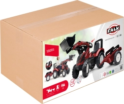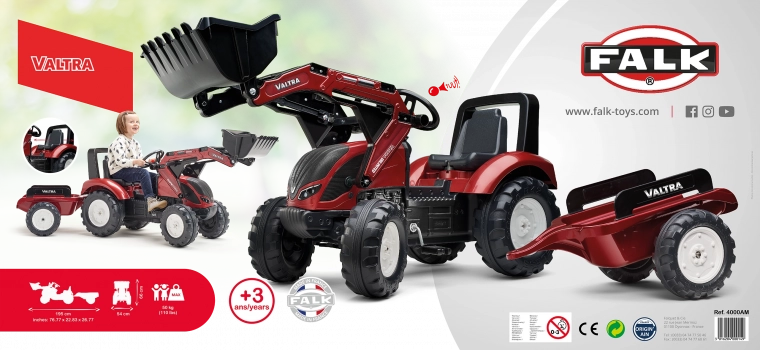 Der Trettraktor VALTRA der Marke FALK begeistert jeden kleinen Bauern. Er bietet eine funktionale Frontschaufel zum Laden, einen abnehmbaren Anhänger zum Transport von Spielzeug und eine Hupe am Lenkrad. Dank Kettenantrieb, stabiler Konstruktion und robusten Kunststoffrädern ist er ideal für das Spielen im Freien und fördert Motorik und Koordination.
