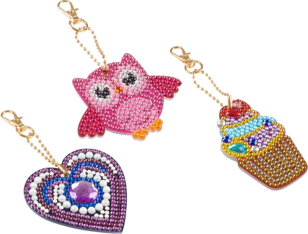 Dieses Set ermöglicht es Ihnen, drei verschiedene Schlüsselanhänger in Form einer Eule, Eiscreme und eines Herzens zu gestalten. Jeder Schlüsselanhänger ist mit bunten Steinen verziert, die Ihren Schlüsseln einen persönlichen Stil verleihen.