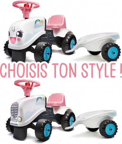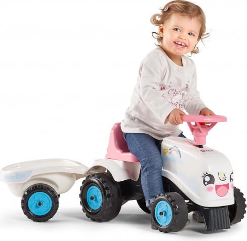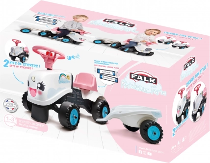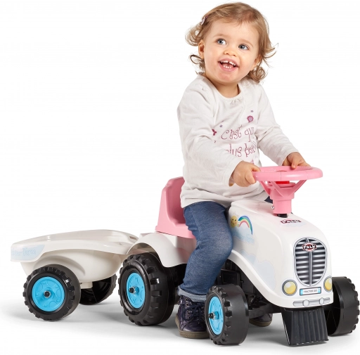 Der Trettraktor Falk Rainbow in weißer Ausführung mit abnehmbarem Anhänger ist der Traum eines jeden kleinen Landwirts. Er ist mit Präzision bis ins Detail gefertigt und ideal für Kinder ab 12 Monaten. Das Fahrzeug hat Plastikräder und eine Konstruktion aus hochwertigen Materialien.