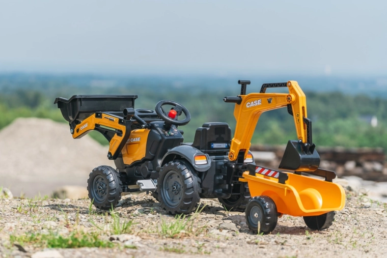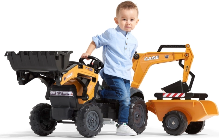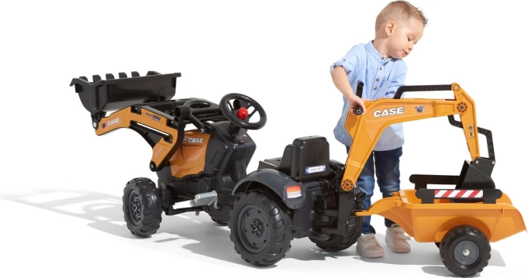 Trettraktor CASE mit Frontschaufel, Heckbagger und abnehmbarem Anhänger FALK Eco Design