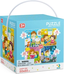 Kinderpuzzle der Marke DODO mit Bildern von täglichen Aktivitäten. Puzzlemaße nach dem Zusammensetzen: 22×22 cm. Alter: 3+.