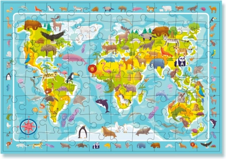Entdecken Sie die Welt der Fauna mit diesen farbenfrohen Puzzeln, die Kinder nicht nur unterhalten, sondern auch etwas lehren. Nach dem Zusammensetzen können sie das Spiel Finde und Suche spielen und die Position der Tiere auf der Weltkarte bestimmen. Lernpuzzle mit 80 Teilen fördern Aufmerksamkeit, Feinmotorik und logisches Denken.