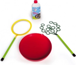 Im Set enthalten sind zwei Ringe – einer für riesige Blasen und einer für viele kleine Bläschen, außerdem eine rote Schüssel zum bequemen Eintauchen und eine 0,5 l Nachfüllung. Ideal für den Familiennachmittag, Feiern und Spiele im Freien.