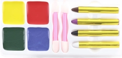 4 Gesichtsfarben (Orange, Blau, Rosa, Schwarz), 4 Stifte (Weiß, Rot, Gelb, Schwarz), 2 Applikatoren