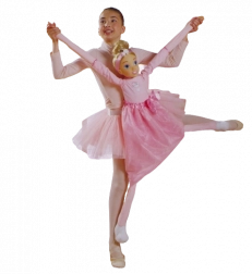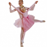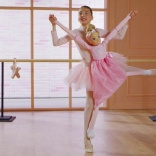 Ballerina Molly trägt ein bezauberndes rosafarbenes Kleid mit passendem Haarband und einer eleganten Duttfrisur. Ihr Gesicht ist fein ausgearbeitet, mit großen Augen, die ihren eleganten Look unterstreichen.