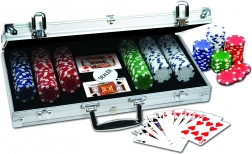 Komplettes Poker-Set in einem eleganten Aluminiumkoffer für Heimturniere und Unterhaltung mit Freunden. Enthält 300 hochwertige Chips mit einem Gewicht von 11,5 g in 4 Farben mit Würfelsymbolen – ideal für ein authentisches Spielerlebnis.