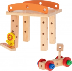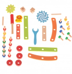 Zum Lieferumfang gehören ein Holzschraubendreher und ein Schlüssel, sodass kleine Baumeister alles Nötige zur Hand haben. Bunte Teile mit spielerischen Motiven (z. B. Löwe und Zahnräder) unterstützen kreatives Spiel und das Erkennen von Farben. Ein toller Tipp für ein pädagogisch wertvolles Spielzeug und ein Geschenk, das stundenlang beschäftigt.