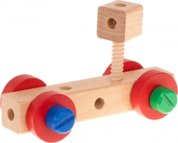 Enthalten sind ein Holzschraubendreher, ein Schlüssel, Schrauben und Muttern – Kinder lernen, Teile korrekt zu verbinden und trainieren die Feinmotorik.