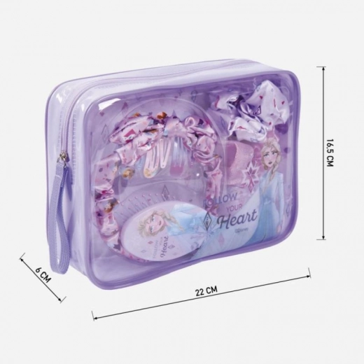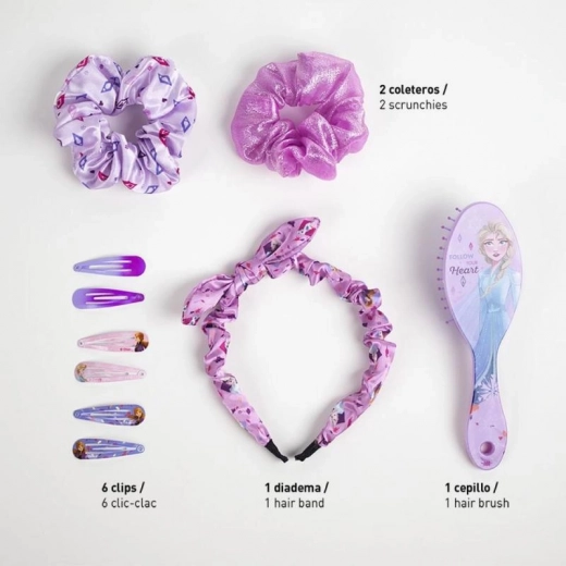 Geschenkset Haaraccessoires FROZEN II (10 Stk.) mit Reißverschlusstäschchen: Haarspangen, Haarreif, Bürste und Satin-Haargummis. Ideal für Mädchen ab 6 Jahren.