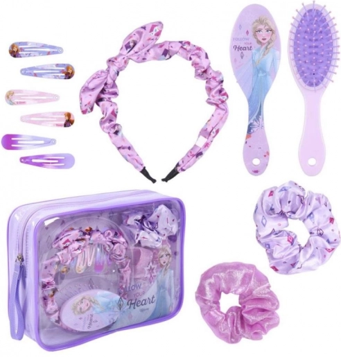 Ein entzückendes Geschenkset mit Haaraccessoires im FROZEN II-Design erfreut jede kleine Fashionista. Enthält 10 praktische Teile: 6 Metall-Haarspangen mit Applikation, einen Haarreif mit Schleife, eine Bürste und 2 Satin-Haargummis. Alles verpackt in einem praktischen Reißverschlusstäschchen – ideal für zu Hause und unterwegs. Geeignet für Kinder ab 6 Jahren.