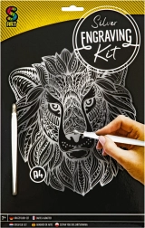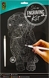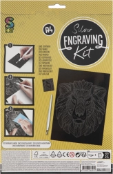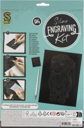 Im Set ist alles enthalten: Bild 25 × 20 cm, Kunststoff-Kratzstift mit Metallspitze sowie eine Testkarte zum Üben von Strichen und Texturen.