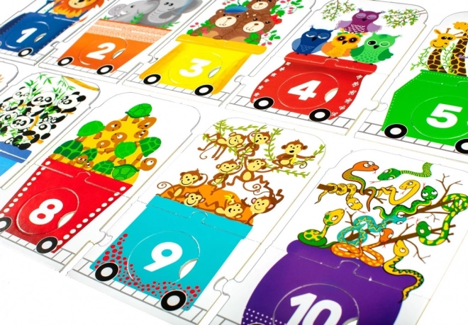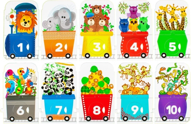 Das Kinderpuzzle in Form eines Zuges stellt eine unterhaltsame Herausforderung für kleine Entdecker dar. Es besteht aus einer Lokomotive und neun Waggons, jeder mit einer unterschiedlichen Anzahl an Tieren: