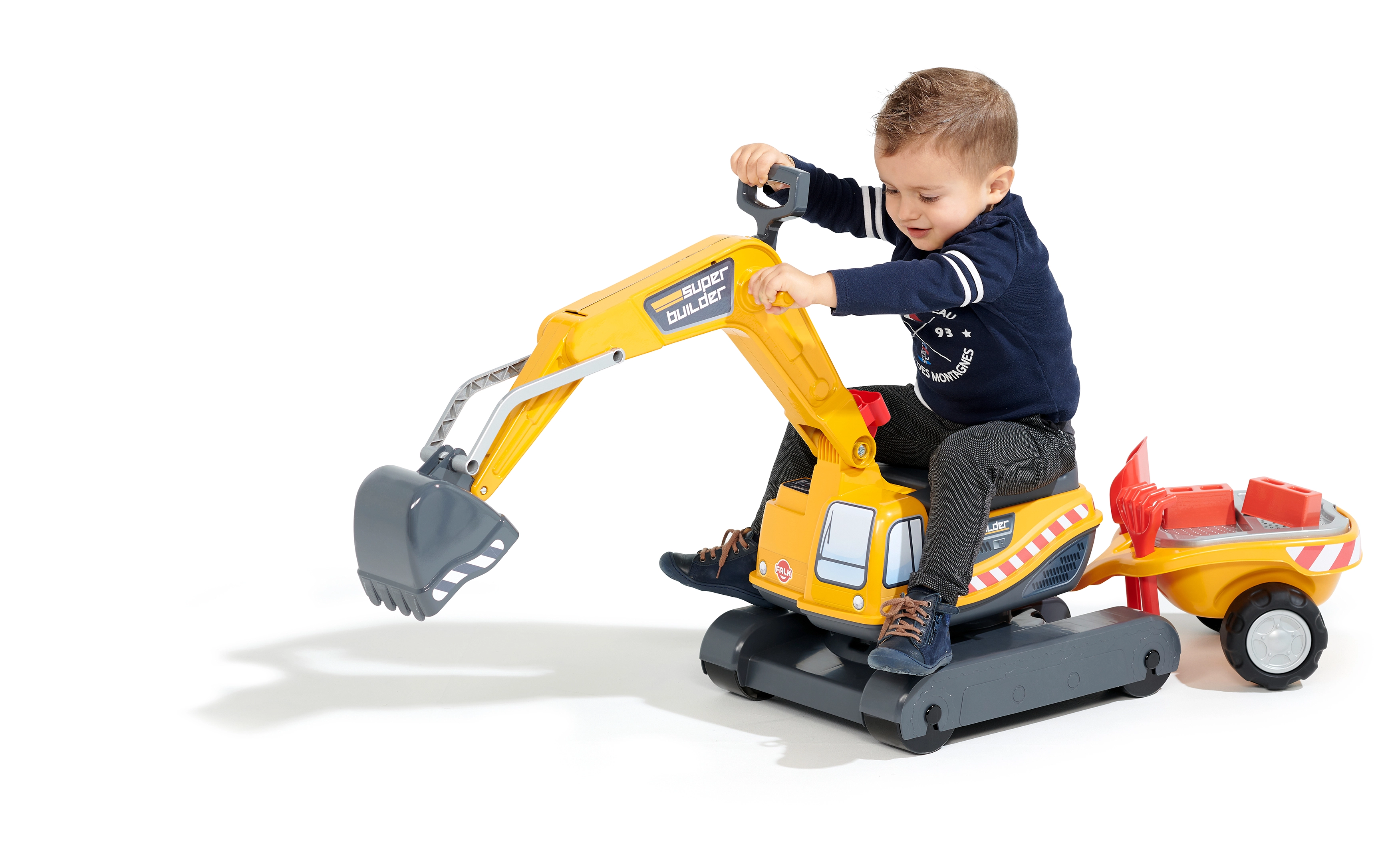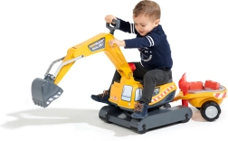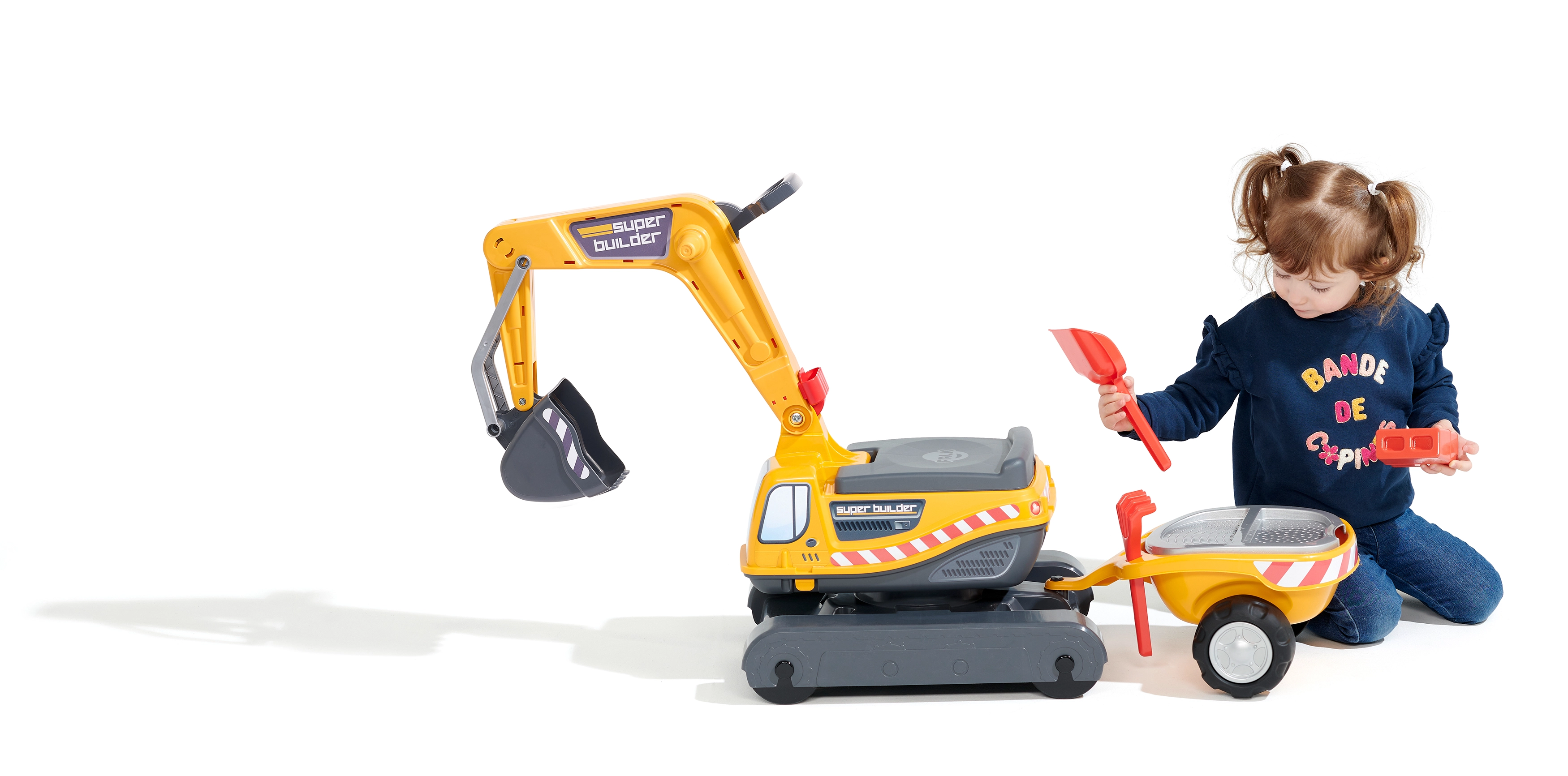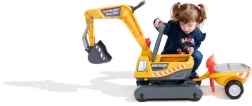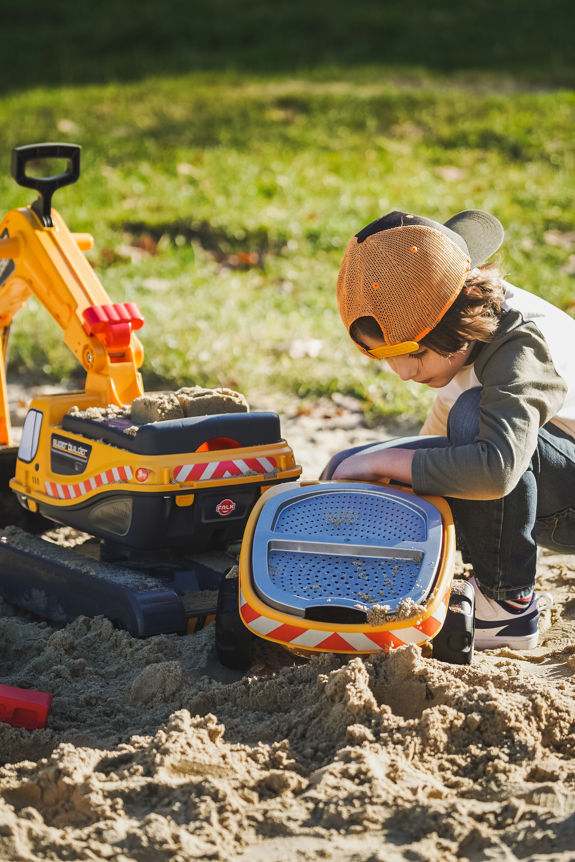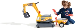 Rutscher Super Kettenbagger in Orange mit funktionsfähiger Schaufel, Kettenimitation, Anhänger und Sandspiel-Set – 2× Sandförmchen in Ziegelform, Schaufel und Harke. Aus hochwertigem und strapazierfähigem Kunststoff. Größe 85×38×67 cm. Alter 3+. Alle Falk-Traktoren sind bis 50 kg getestet – gemäß den Anforderungen europäischer Normen. Hergestellt in Frankreich.